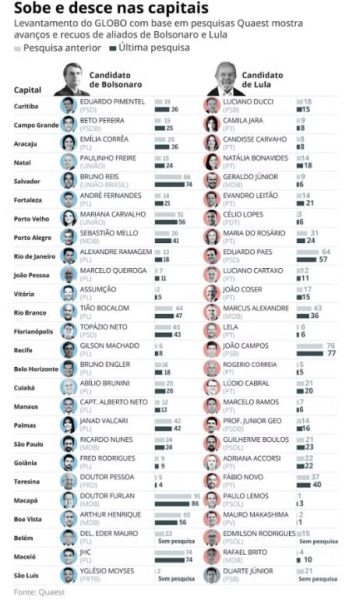 Houve crescimento de nomes apoiados por Bolsonaro em Campo Grande, Natal e Salvador. Em Natal, pelo levantamento da Quaest, Paulinho Freire (União), que tem o apoio de aliados do presidente Bolsonaro, passou de 15% para 24% das intenções de voto. A adversária Natália (PT) teve menor movimentação nos dados do instituto saindo de 14% para 18%.
