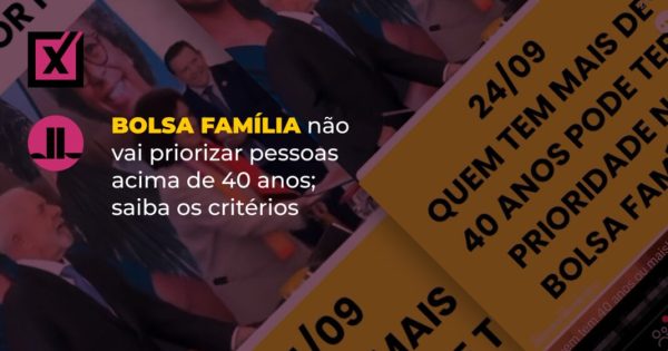 É falso que o Bolsa Família, do governo federal, vai priorizar pessoas acima de 40 anos. O Ministério do Desenvolvimento e Assistência Social (MDS) disse ao Comprova que não há critério de prioridade para essa faixa etária ligado ao recebimento do benefício. Têm prioridade, segundo o órgão, famílias indígenas e quilombolas e com crianças resgatadas de situação de trabalho infantil, integrantes resgatados de situação análoga à de trabalho escravo e catadores de material reciclável.