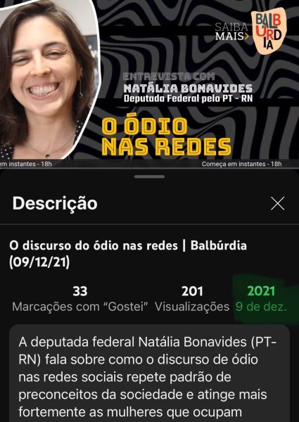 Um fato que chama atenção é que um desses prints usados por Natália mostra um comentário feito em resposta a um storie de Instagram de um card do portal de esquerda Saiba Mais RN, onde consta um link de uma entrevista AO VIVO concedida por Natália ao referido portal em uma live que tratava do tema “O ódio nas redes”, ocorrida NO DIA 09 DE DEZEMBRO DE 2021 como pode ser provado através de busca no canal do YouTube do portal Saiba Mais RN.