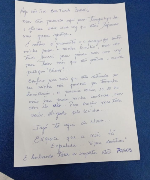 “Hoje não teve boa-tarde, Brasil! Mas estou passando aqui para tranquilizá-los e afirmar mais uma vez que estou sofrendo uma grande injustiça. É notório o preconceito e a perseguição contra minha pessoa e minha família, mas isso tudo servirá para provar mais uma vez para todos vocês que não pratico e nunca pratiquei ‘crimes’.