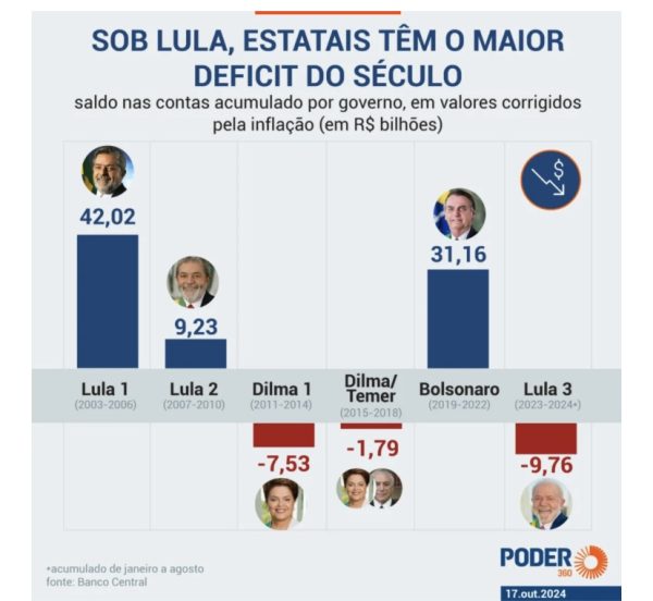 As empresas estatais federais, estaduais e municipais registraram deficit de R$ 9,76 bilhões em valores corrigidos pela inflação (a preços de setembro) durante o 3º mandato de Luiz Inácio Lula da Silva (PT). É o maior saldo negativo do século 21 em menos de 2 anos (2023 e 2024).