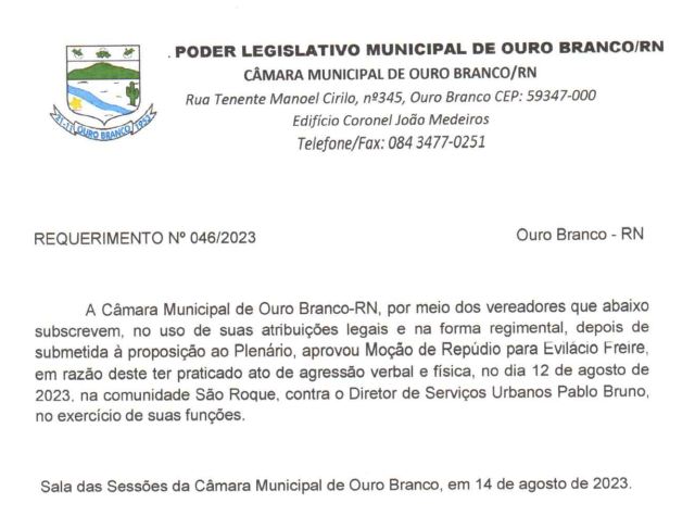 A Câmara Municipal de Ouro Branco (RN), por maioria dos presentes, aprovou na sessão plenária da última segunda-feira (14), uma Moção de Repúdio para Evilácio Freire pela prática de agressão verbal e física no sábado, dia 12 de agosto de 2023, na comunidade rural São Roque, contra o Diretor de Serviços Urbanos, Pablo Bruno, que estava no exercício das suas funções.