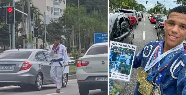Cena inusitada nas ruas do Rio. Por longas horas do dia, Ronald Ferreira troca os tatames do jiu-jítsu pelo asfalto quente do Recreio dos Bandeirantes, bairro da Zona Oeste da cidade. Entre carros parados no trânsito, o jovem de 18 anos circula pedindo ajuda financeira para suas competições. A coluna GENTE flagrou um desses momentos e abordou o rapaz, que vestia quimono e ostentava suas várias medalhas no pescoço.