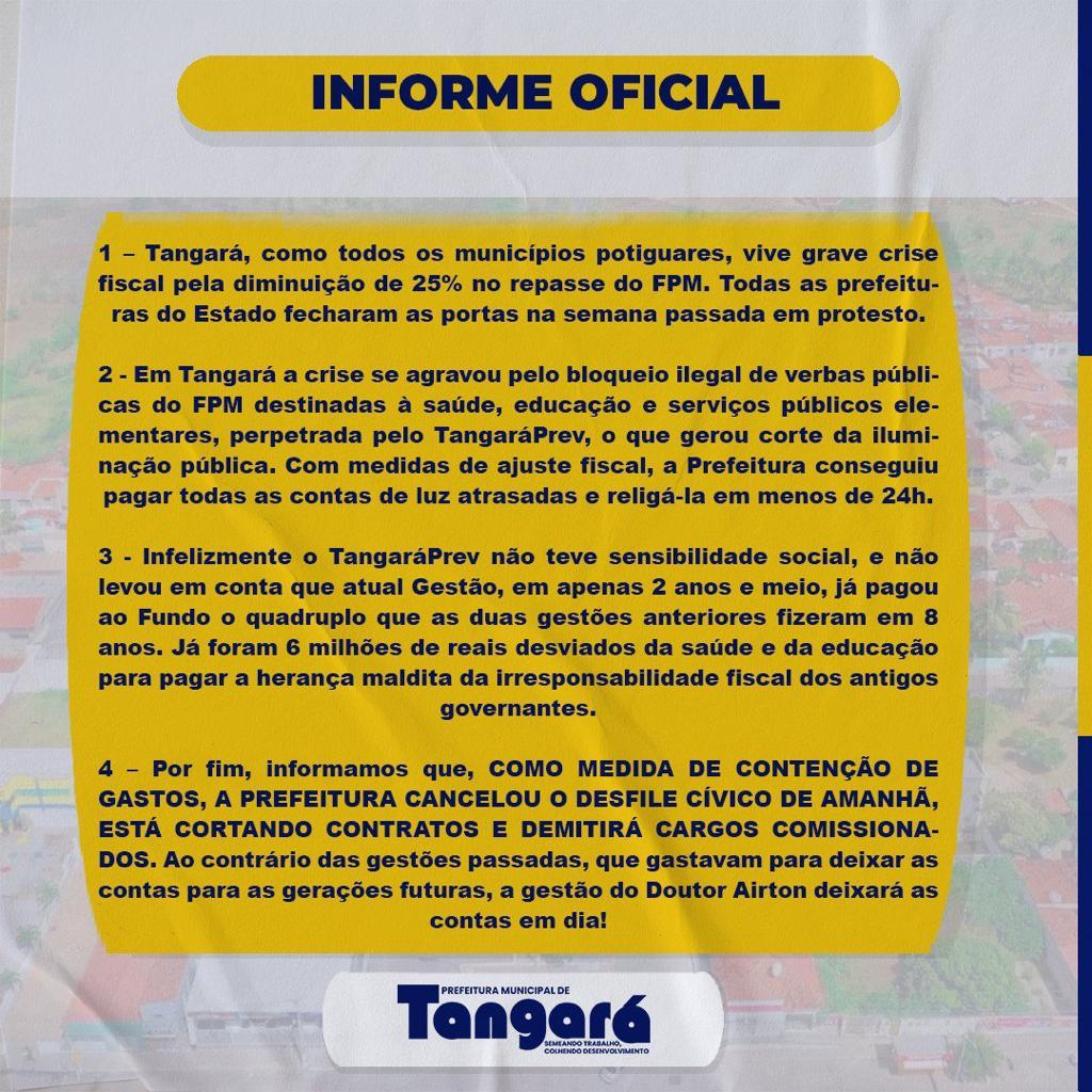 Agora, diante da continuidade da crise, a Prefeitura anunciou que até o desfile de 7 de setembro será cancelado. “informamos que, COMO MEDIDA DE CONTENÇÃO DE GASTOS, A PREFEITURA CANCELOU O DESFILE CÍVICO DE AMANHÃ, ESTÁ CORTANDO CONTRATOS E DEMITIRÁ CARGOS COMISSIONADOS”, decretou.