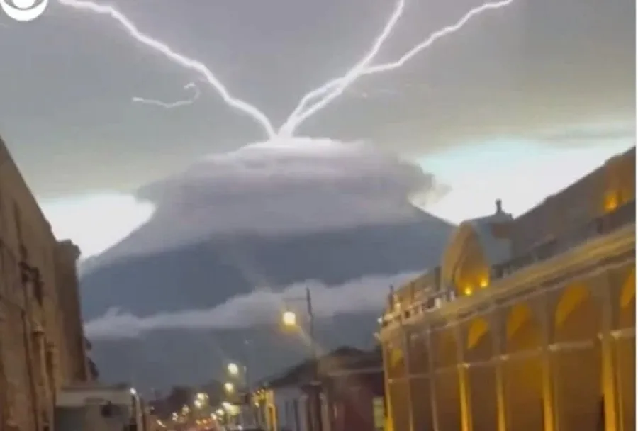 Uma tempestade produziu uma ilusão de ótica quando um raio caiu perto do vulcão Acatenango, na cidade de Antigua, na Guatemala, no dia 10 de julho.