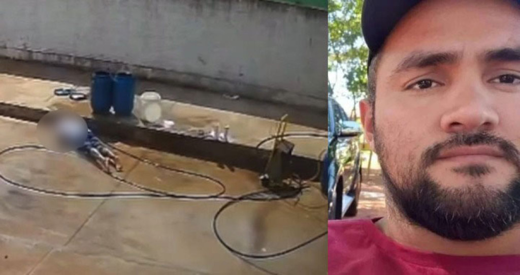 Vídeo mostra o momento em que um homem, identificado como Oziel Rodrigues da Silva, de 37 anos, morreu na tarde deste sábado (12) ao sofrer uma descarga elétrica, enquanto limpava uma calçada, com uma lavadora industrial, em Várzea Grande.