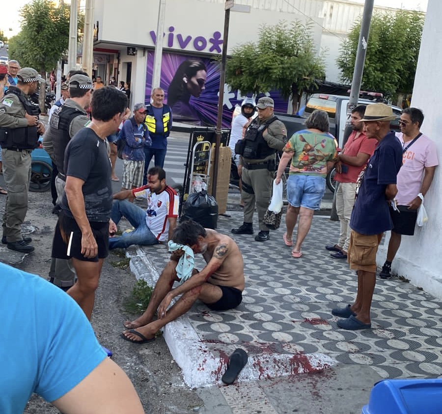 Um comerciário e um servidor público trocaram cabeçadas na tarde desta segunda-feira (14) em Caicó, na esquina onde fica localizada uma agência do Banco Bradesco. A imagem que restou após a confusão mostra ambos feridos, sentados na calçada manchada de sangue enquanto eram observados por populares curiosos e policiais militares.