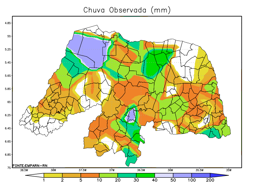 A Empresa de Pesquisa Agropecuária do Rio Grande do Norte (Emparn) informou nesta segunda-feira (27) que as chuvas registradas no último fim de semana no interior do estado devem continuar ao longo desta semana. De acordo com análises da Unidade Instrumental de Meteorologia da empresa, as regiões Oeste e Central devem registrar índices acumulados de chuva entre 30 mm e 60 mm.