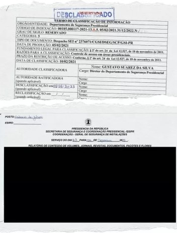 Os documentos constam como “desclassificados”. Reportagem solicitou documentos que estão no “rol de informações desclassificadas” pelo GSI (Gabinete de Segurança Institucional), divulgado pelo próprio governo em 2023 e que segue público na página oficial do Executivo.