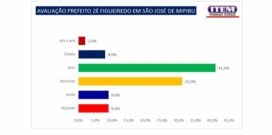 A gestão do prefeito Zé Figueiredo é aprovada por 80% dos eleitores de São José de Mipibu, segundo a Item Pesquisas, que entrevistou 486 pessoas, nos dias 14 e 15 de agosto. Avaliaram como ruim e péssima 9%, respectivamente, e não sabem ou não responderam foram 2%.