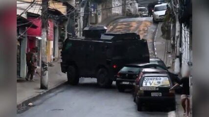 Um Caveirão (blindado da Polícia Militar) derrapou em uma ladeira e quase atropelou um morador durante uma operação no Complexo do Alemão, na Zona Norte do Rio, na manhã desta quarta-feira (15). Ao descer descontrolado, o veículo atingiu 3 carros e 1 moto.