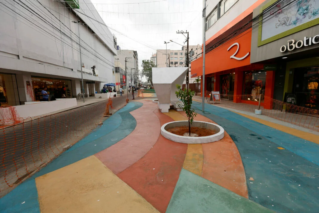 Da esquina com a Avenida Deodoro da Fonseca, já é possível perceber as mudanças que a obra na Rua João Pessoa, no Centro de Natal, trará para a área comercial do Centro Histórico da capital potiguar. O piso colorido da primeira quadra, que vai até a Rua Felipe Camarão, está quase finalizado. Bancos cobertos, calçadas reformadas e a reorganização das árvores já dão um tom renovado à via, cuja primeira etapa deverá ser entregue até o final deste mês, segundo a Secretaria Municipal de Mobilidade Urbana (STTU), responsável pelo projeto.