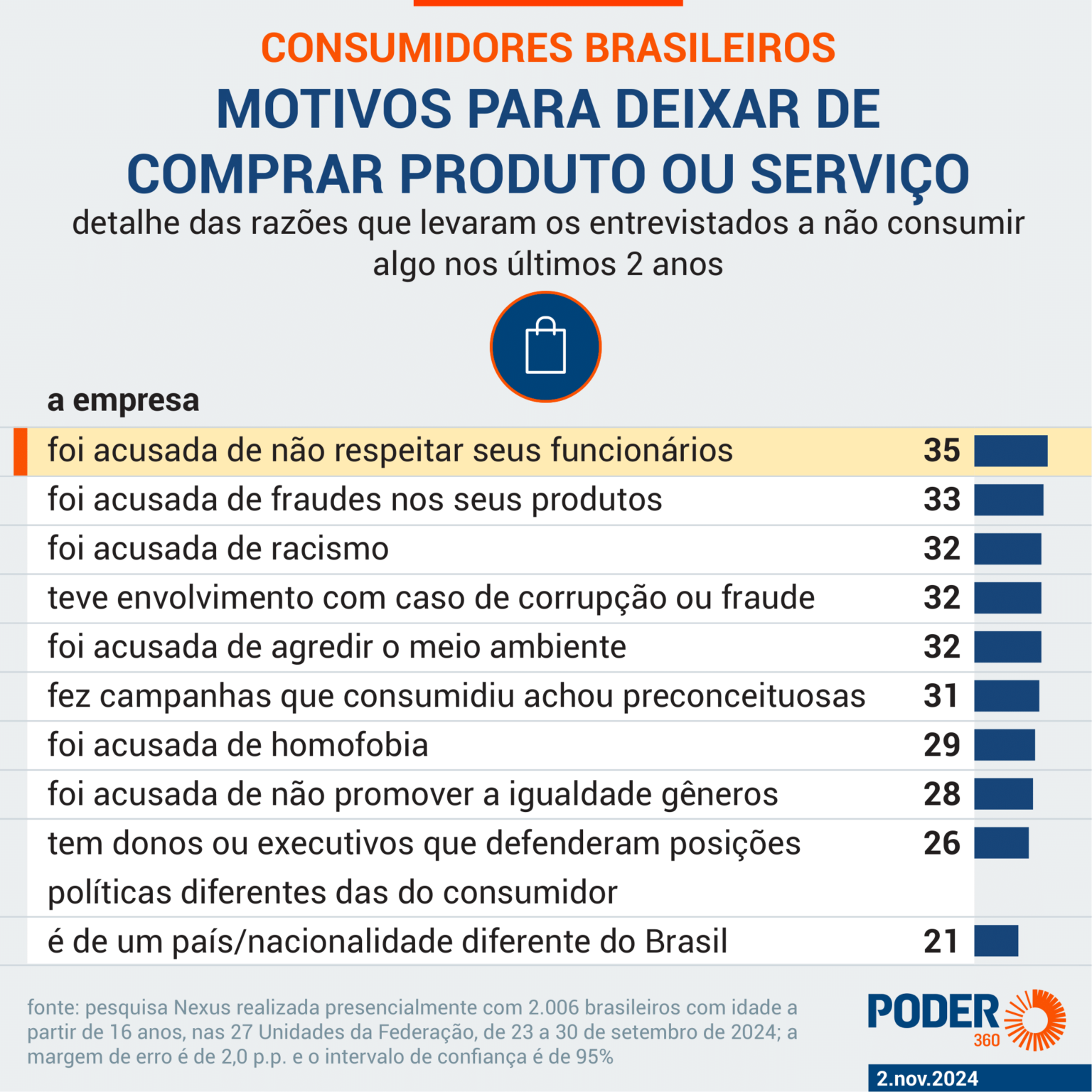Pesquisa feita pela Nexus indica que, nos 2 últimos anos, 47% dos brasileiros deixaram de comprar produtos ou serviços de empresas que se envolveram em episódios de desrespeito ou discriminação –como racismo, homofobia e desrespeito com funcionários. Ao se acrescentar os boicotes ocasionados por questões relacionadas à compliance ou a posicionamentos políticos, esse percentual sobe para 59%.