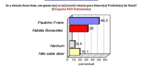 A pesquisa Consult/TN aponta na amostragem não estimulada, que Paulinho Freire conta com 46,5% dos sufrágios e Natália Bonavides, que tem o apoio da governadora Fátima Bezerra (PT), teria 29,0% dos votos. Os eleitores que disseram não votar em nenhum candidato são 8.40% e não souberam dizer, 16.10%. A primeira pesquisa de intenções de votos para a disputa da prefeitura de Natal, no segundo turno, utilizou uma amostra probabilística casual simples de 1.000 entrevistas, distribuídas nas quatro zonas da cidade.