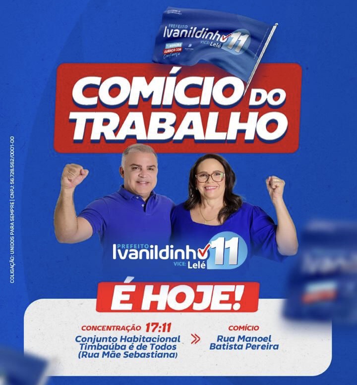 A expectativa dos timbaubenses está grande para este domingão! Hoje (22) acontecerá o grande “Comício do Trabalho”, com o prefeito e candidato à reeleição, Ivanildinho 11 e vice Lelé.