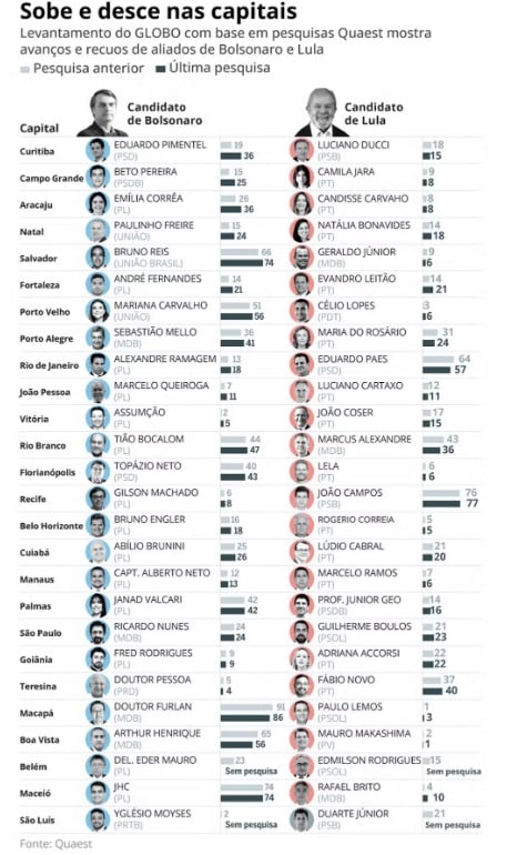 Em 17 capitais, aliados do ex-presidente Jair Bolsonaro (PL) registraram melhora nas intenções de voto. Nesse grupo, seis tiveram crescimento, considerando a margem de erro. Já entre os apoiados pelo petista, houve oscilação positiva em sete capitais e crescimento apenas em Fortaleza.