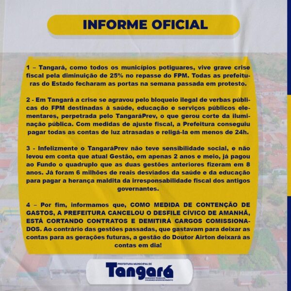 Agora, diante da continuidade da crise, a Prefeitura anunciou que até o desfile de 7 de setembro será cancelado. “informamos que, COMO MEDIDA DE CONTENÇÃO DE GASTOS, A PREFEITURA CANCELOU O DESFILE CÍVICO DE AMANHÃ, ESTÁ CORTANDO CONTRATOS E DEMITIRÁ CARGOS COMISSIONADOS”, decretou.