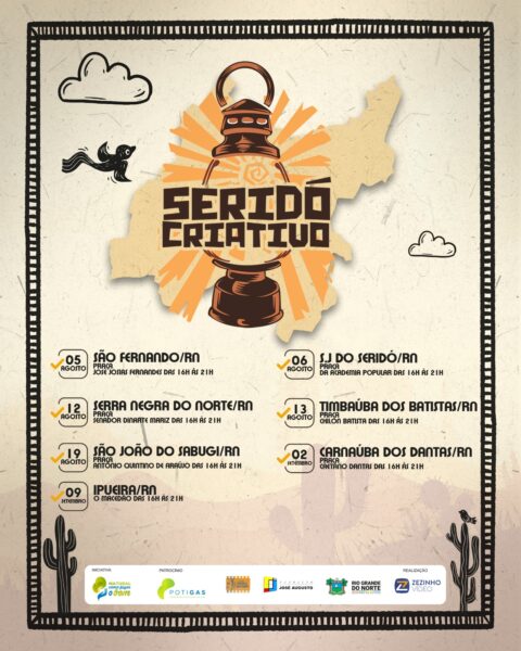 Será de 05 de agosto a 09 de setembro, o Projeto Seridó Criativo que vai visitar sete cidades do Seridó levando a cultura popular com atividades gratuitas, e fomento da economia criativa, através da exposição e comercialização de artes e artesanato de Caicó e cidades visitadas: São Fernando (05/08), São José do Seridó (06/08), Serra Negra do Norte (12/08), Timbaúba dos Batistas (13/08), São João do Sabugi (19/08), Carnaúba dos Dantas (02/09) e Ipueira (09/09). A primeira cidade que recebe o Projeto Seridó Criativo é São Fernando, no próximo sábado, dia 05, das 16h às 21h na Praça José Josias Fernandes.
