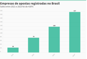 Naquele ano, o Brasil contava com 26 empresas que têm como atividade principal a operações de jogos de azar e apostas online. Já em 2022, o salto foi de 203%, encerrando o ano com 79 empresas.
